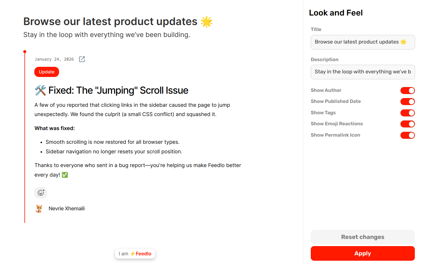 Your Feedlo page shouldn't feel like a third-party tool, it should feel like a native part of your brand. Weโve built a deep customization system that lets you tweak everything from the weight of your headings to the exact hex code of your buttons.